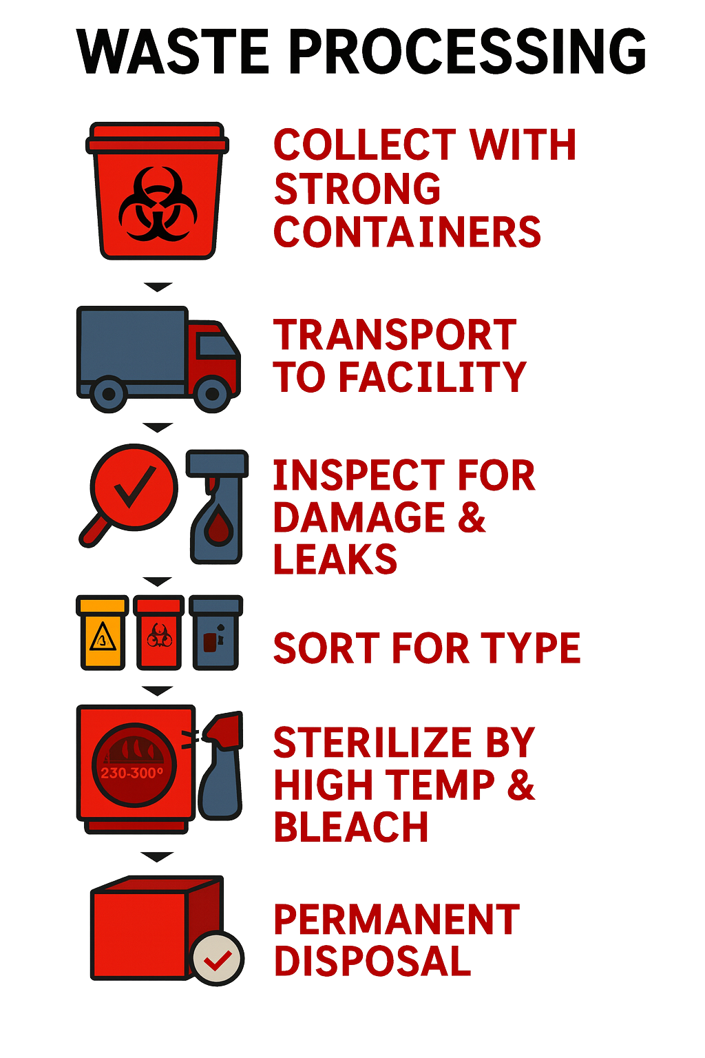 Sharps and biohazardous waste undergo high-temperature steam sterilization (250–300 °F) and may receive secondary